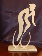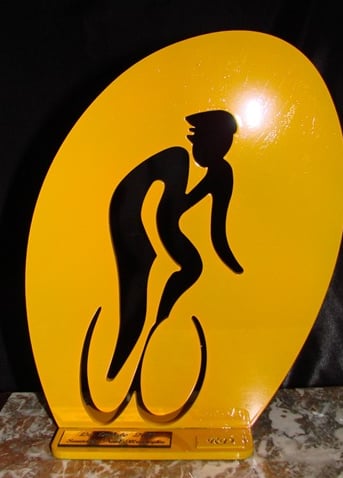 Le trophée est une "essentielle" découpée au laser dans une tôle d'acier de 5 mm et patinée façon acier brossé (2013 et 2015) .